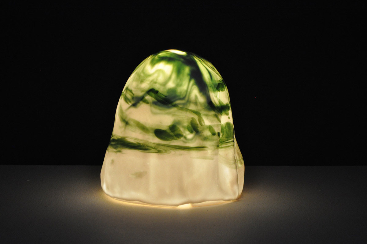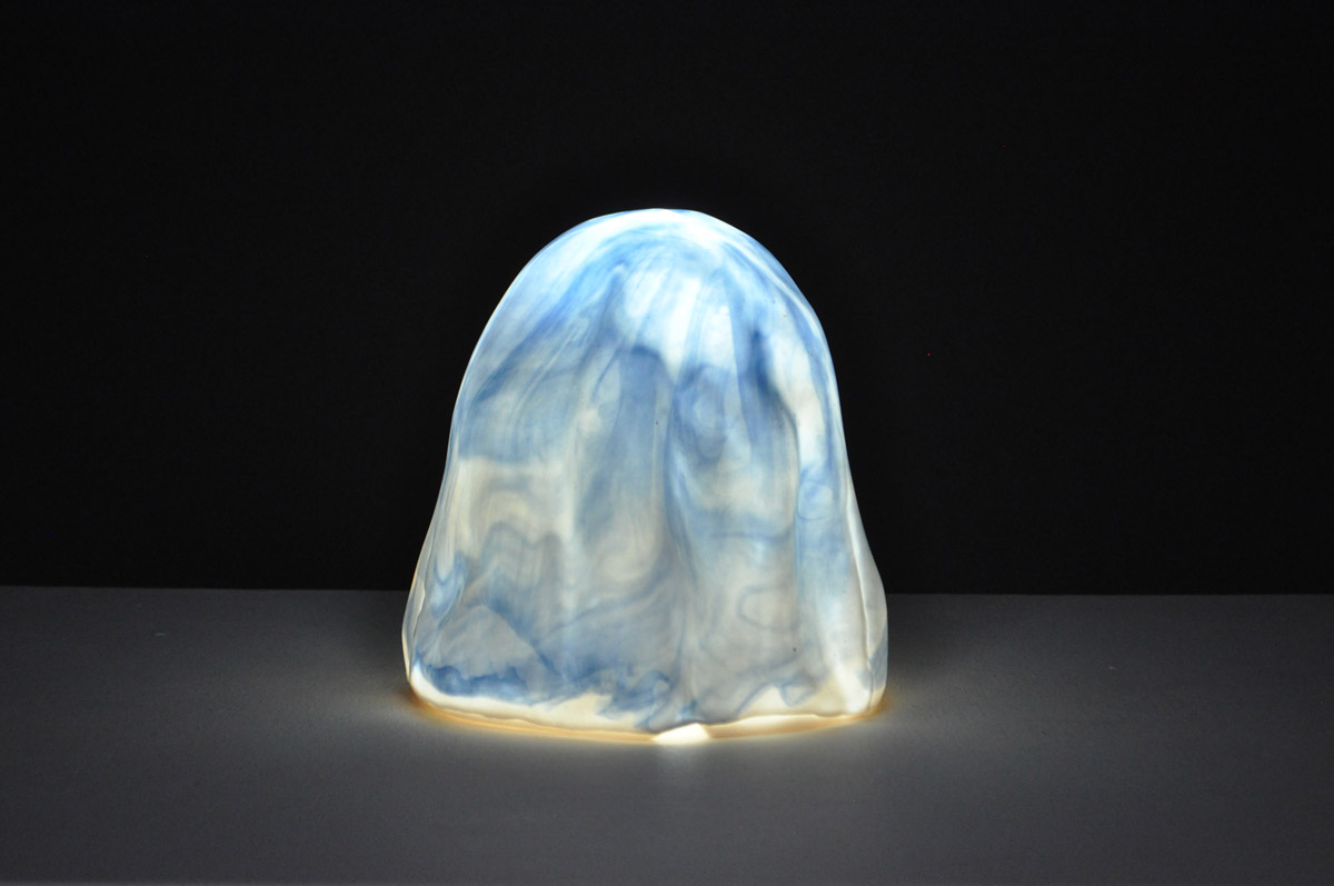 ZH: The lamp is made from a type of ceramic process called slip casting. Soft/Light is made of porcelain, a translucent ceramic body. The shape of the lamp was created from a balled-up quilt I had made the year prior. I balled up the blanket and vacuum formed it (essentially heating up a sheet of plastic and vacuuming it over the blanket to create a mold). From there I took the mold and poured a plaster model (the positive form). I then sanded down the form until it was smooth, leaving some of the ridgelines from the blanket. With that plaster model, I created my slip cast mold and used that mold to pour the lamp form. As for the cup, it is an exact replica of a glass cup. A similar process, except I made a silicone mold from the glass and then poured my plaster model from there.
