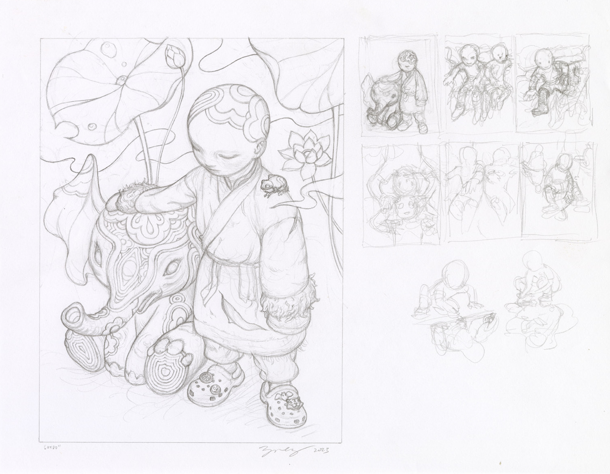James Jean: Dragon II was completed first in the fall of 2023, and I think Nomad was completed last. Dragon II was a bellwether of how the rest of the pieces would go. Actually, the end is a blur, because I was preparing so many different projects at once before traveling to Japan in June. I’m checking through my camera roll aka memory bank, and it’s quite stunning how many things I was doing all at once in April and May.