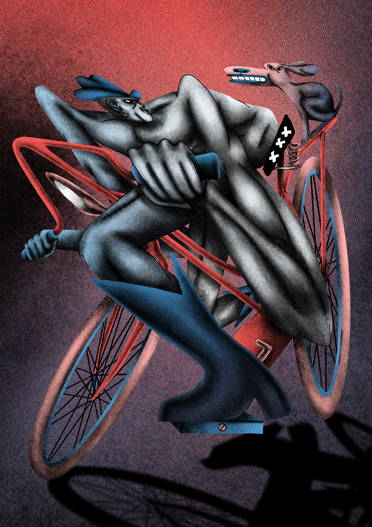 “My artwork often portrays absurd and theatrical scenes featuring characters with distorted muscular bodies. These characters push the boundaries of masculinity and the human form. The distorted perspectives and melodramatic approach highlight the strangeness of seemingly mundane activities. The characters always wear an eerie, almost flirtatious smile, as if inviting the viewer into their world. Dogs often accompany them, symbolizing man or an idealized version of humanity. These dogs embody strength, loyalty, and self-assuredness, but can also experience profound existential despair when confronted with the meaninglessness of life. This dichotomy often manifests through biting and barking.”
