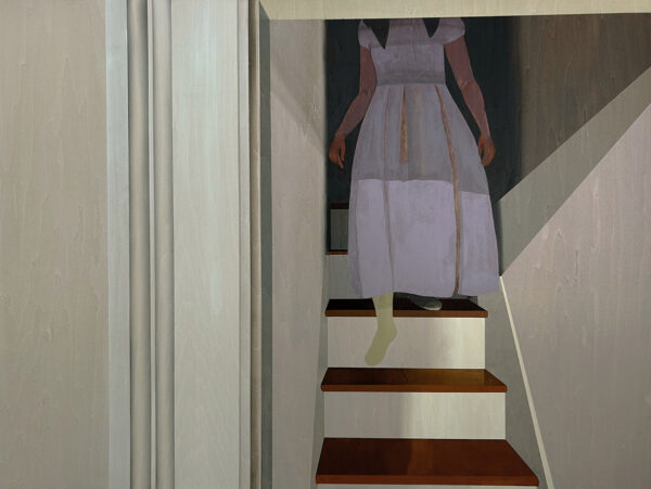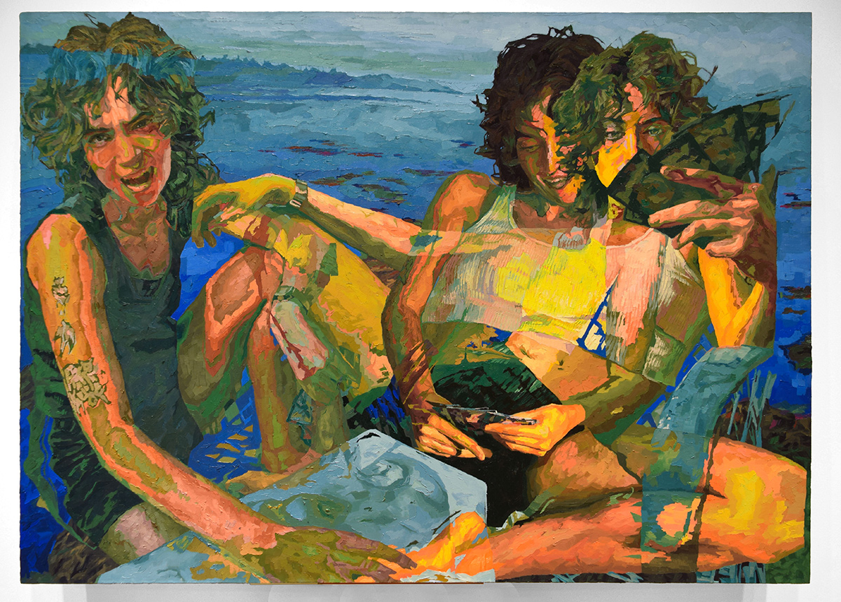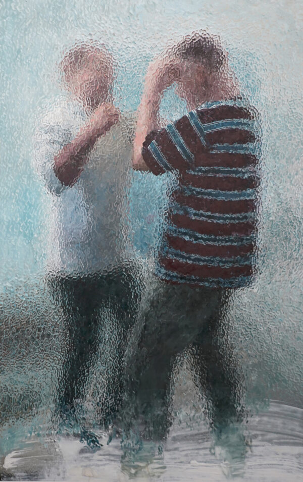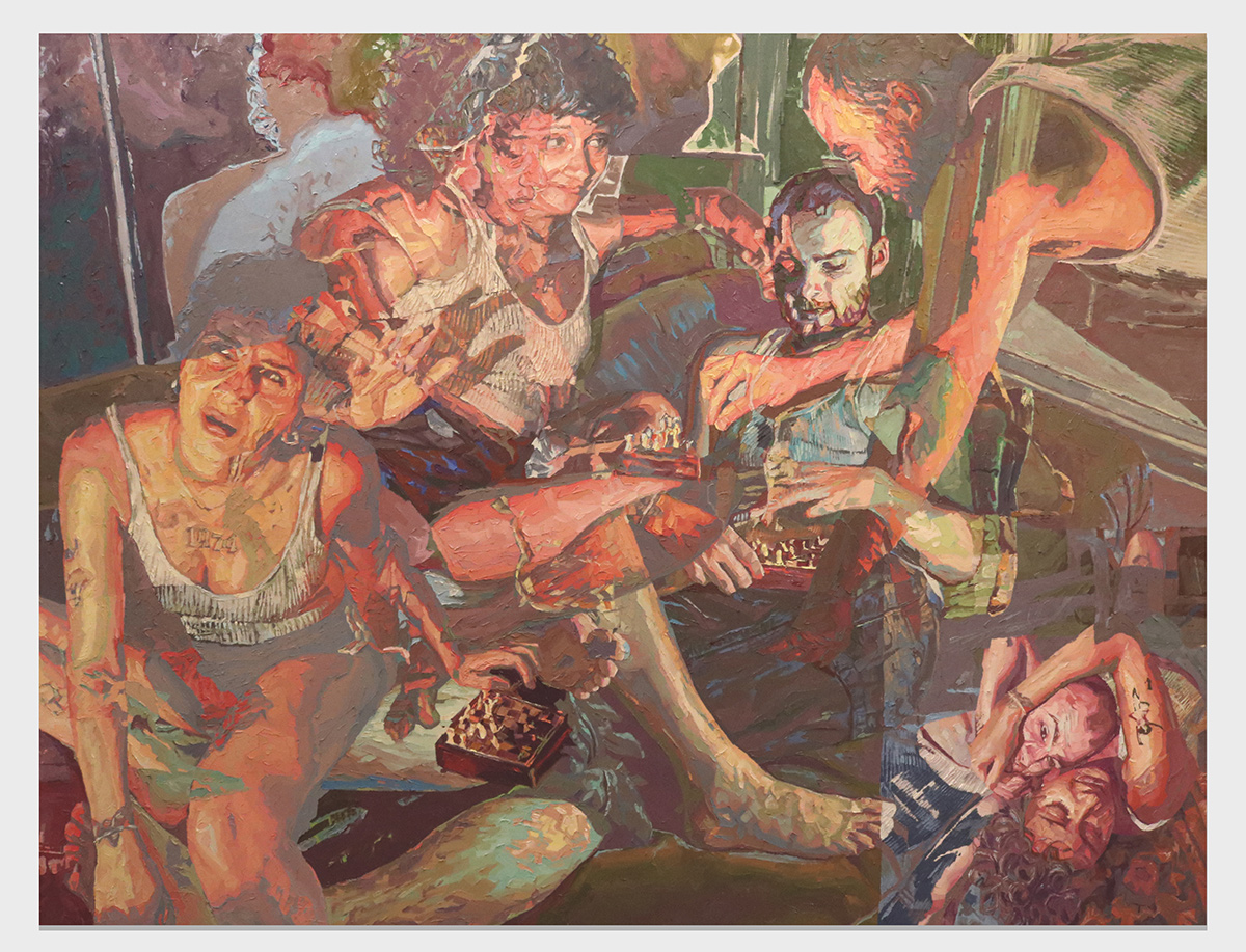 Paintings by artist Lydia Mutone from Richmond, Virginia. Mutone received her BFA from Virginia Commonwealth University in 2021. Her work explores figures within intimate settings and warping memory. She makes use of abstraction, pushing images back and forth via digital editing before transitioning the compilation into oil paint. Playing with legibility and obfuscation, Mutone depicts duplicates of a single subject set in motion yet occupying a stagnant space. Limbs are simultaneously revealed and concealed as figures stumble over one another suggesting both the sense of shifting time and having caught a glimpse of a single mystical moment.