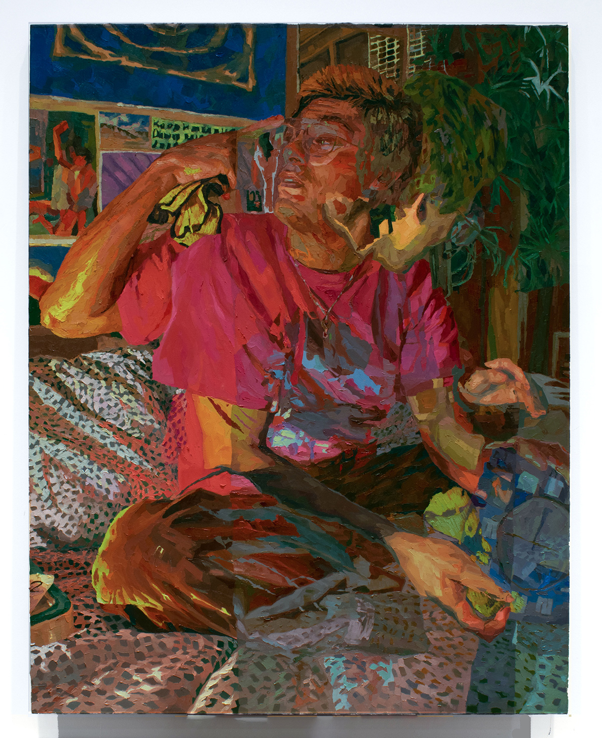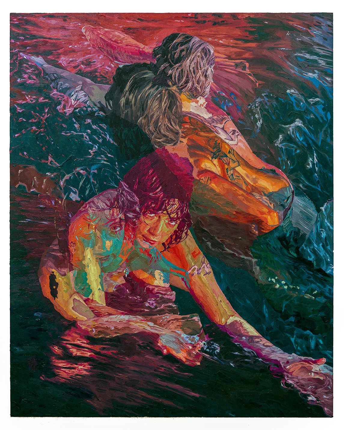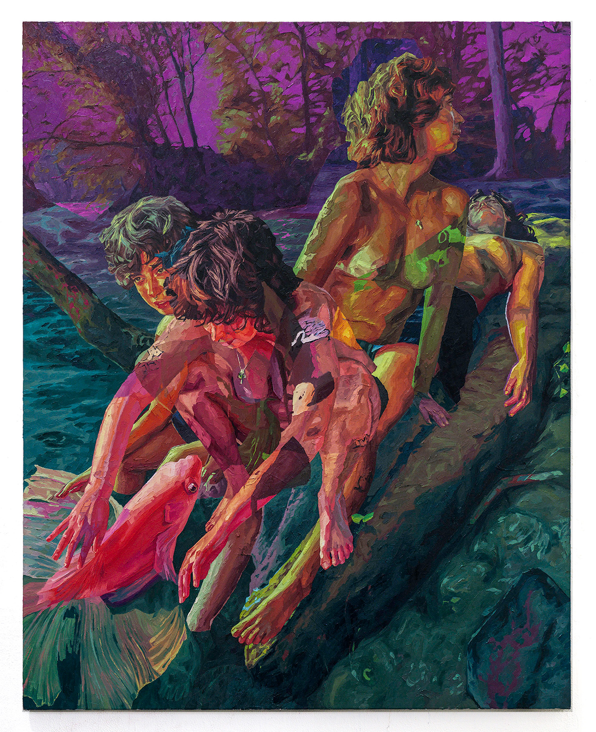 Paintings by artist Lydia Mutone from Richmond, Virginia. Mutone received her BFA from Virginia Commonwealth University in 2021. Her work explores figures within intimate settings and warping memory. She makes use of abstraction, pushing images back and forth via digital editing before transitioning the compilation into oil paint. Playing with legibility and obfuscation, Mutone depicts duplicates of a single subject set in motion yet occupying a stagnant space. Limbs are simultaneously revealed and concealed as figures stumble over one another suggesting both the sense of shifting time and having caught a glimpse of a single mystical moment.