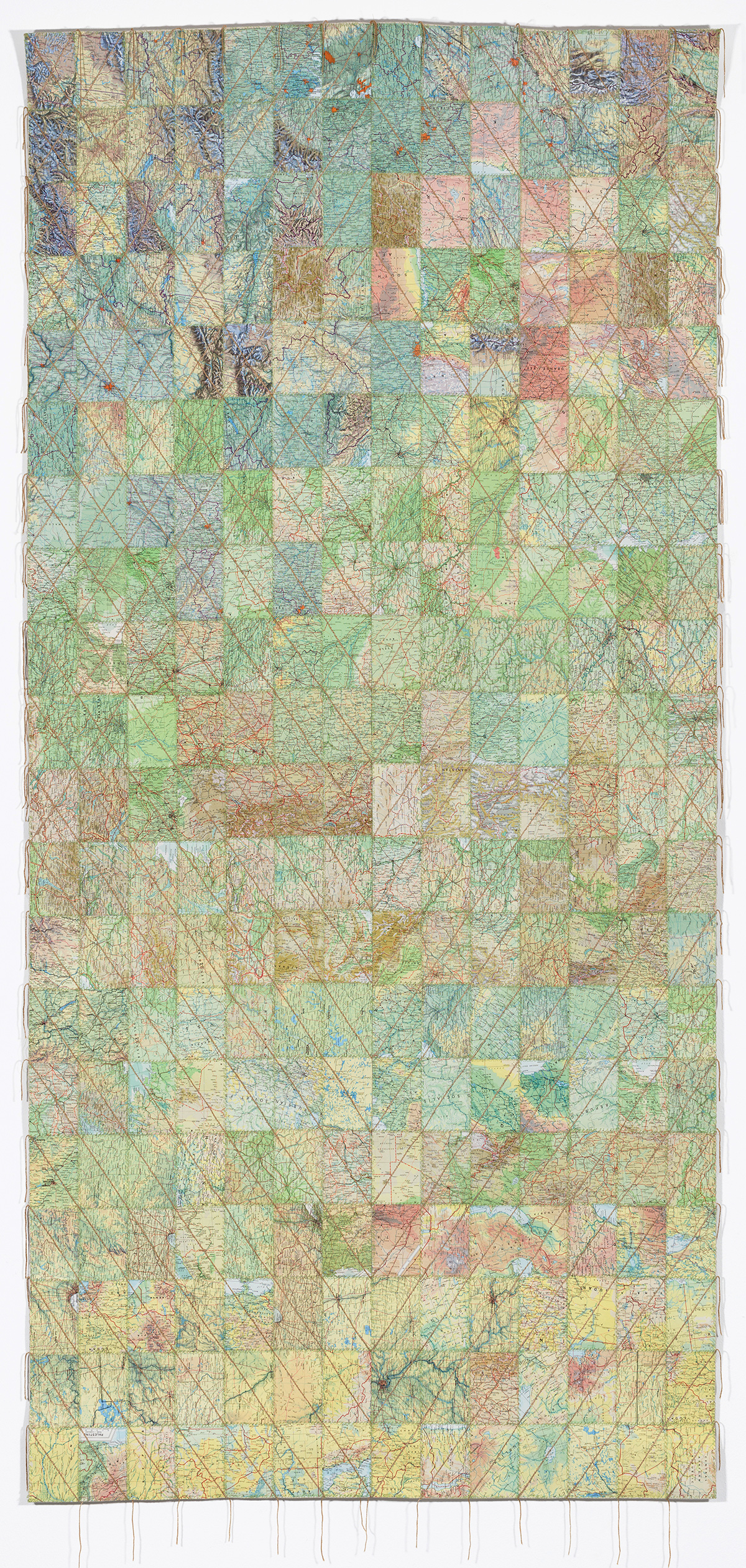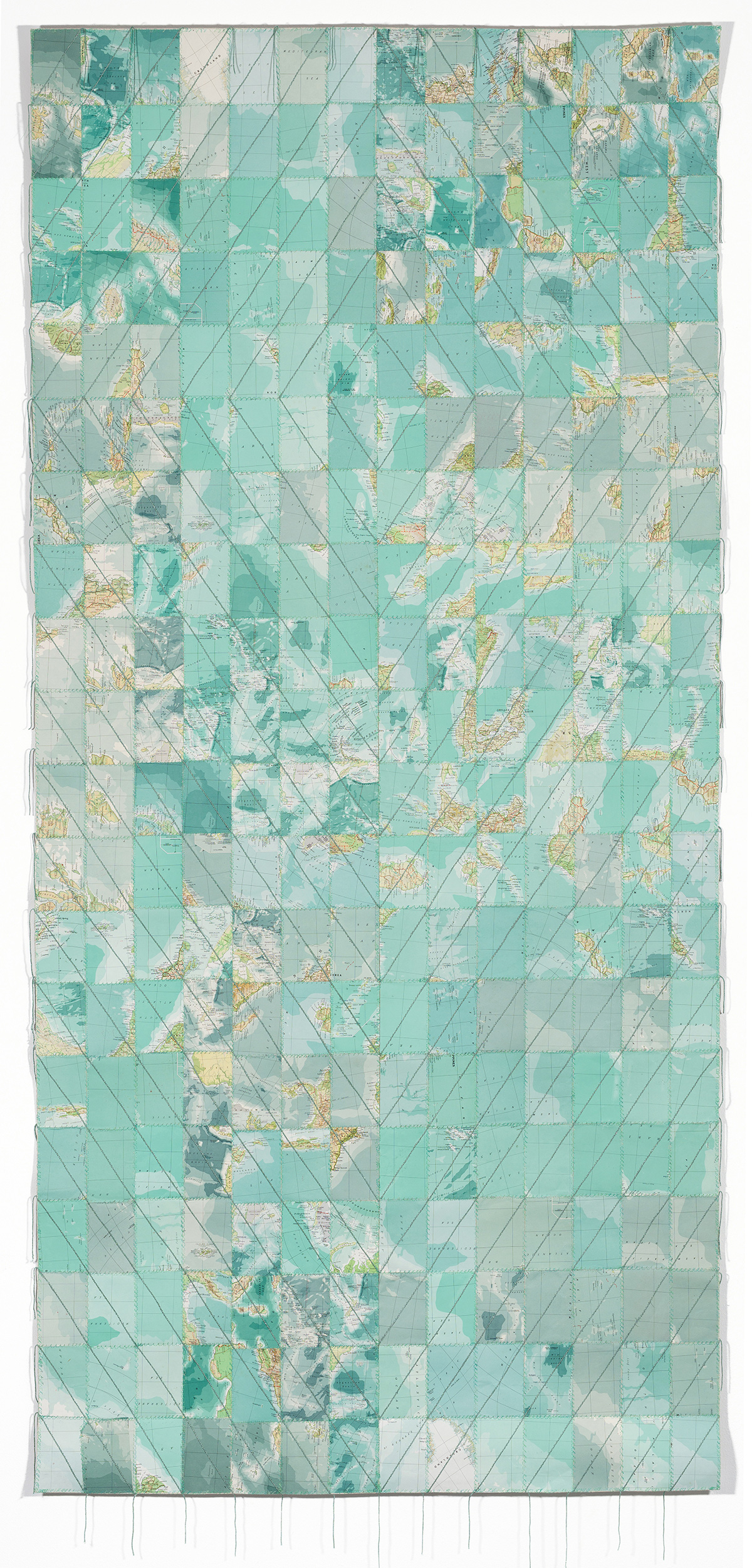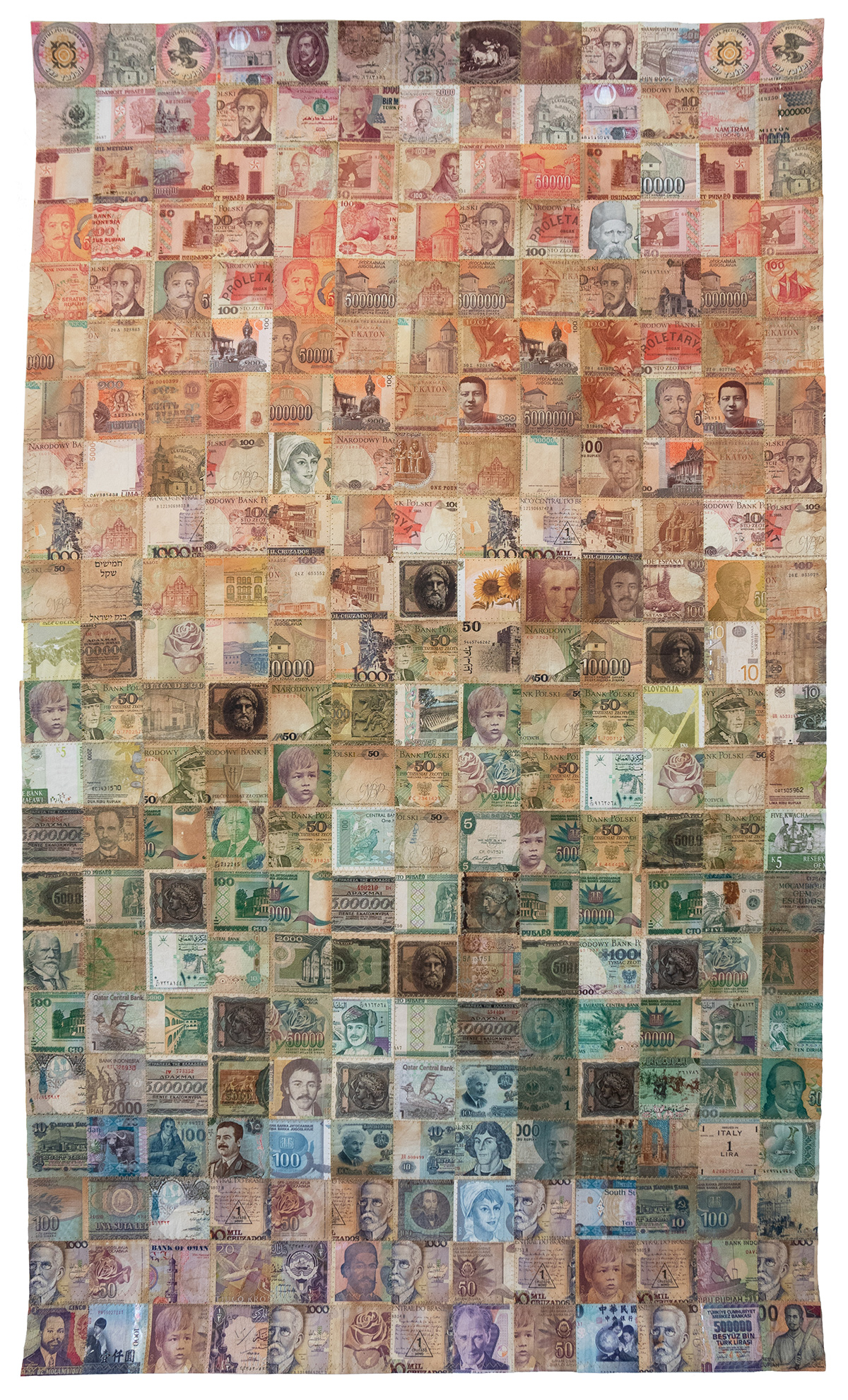 A delicate deconstruction of the economic and geopolitical systems that govern our world by South African artist Faith XLVII (previously featured here). In “Venarum Mundi,” Faith XLVII uses discontinued currency, maps, and flags to literally weave together complex commentaries on value, borders, and shifting global forces. Her intricately hand-sewn tapestries reimagine the boundaries of wealth and place, earth and sea. Meticulously crafted, the artwork draws attention to the fabric of our reality, its fragility, as well as the inherent tensions of migration and territoriality. With each piece Faith XLVII calls into question the very materiality from which it was made—signals of stability rendered obsolete.