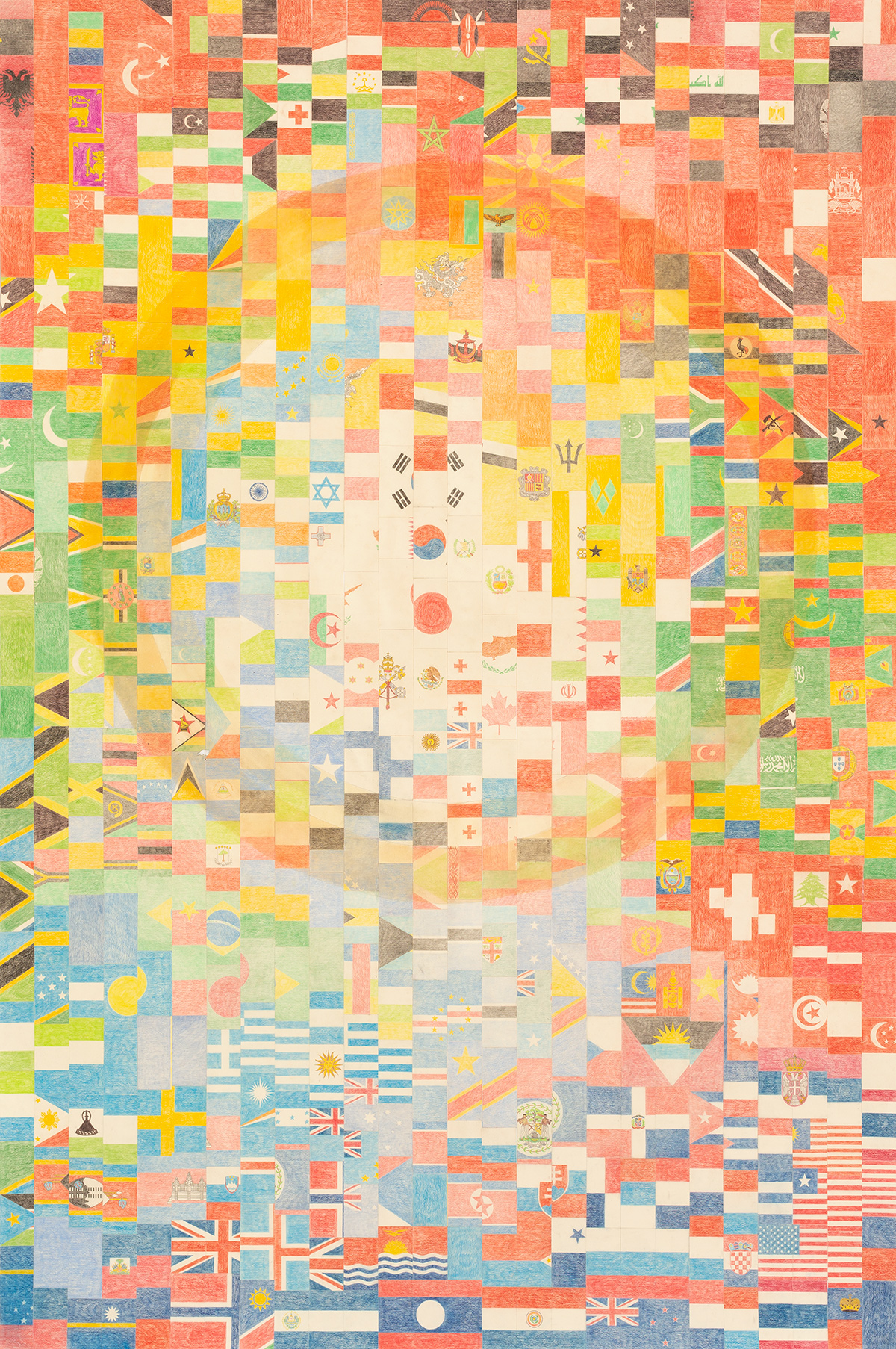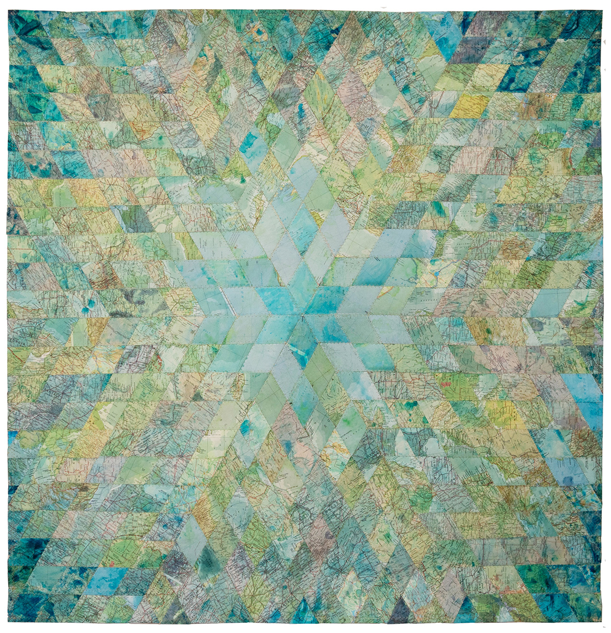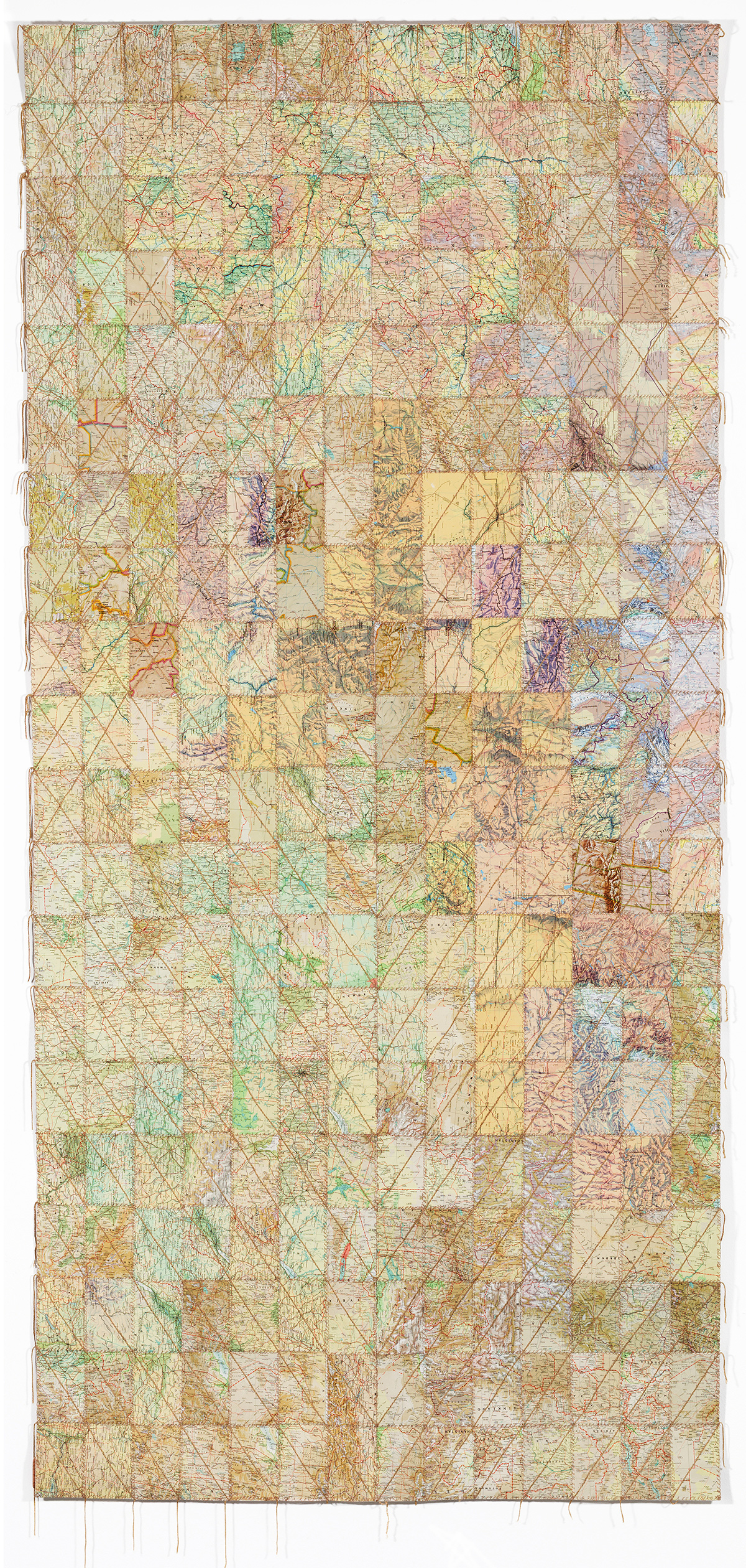 A delicate deconstruction of the economic and geopolitical systems that govern our world by South African artist Faith XLVII (previously featured here). In “Venarum Mundi,” Faith XLVII uses discontinued currency, maps, and flags to literally weave together complex commentaries on value, borders, and shifting global forces. Her intricately hand-sewn tapestries reimagine the boundaries of wealth and place, earth and sea. Meticulously crafted, the artwork draws attention to the fabric of our reality, its fragility, as well as the inherent tensions of migration and territoriality. With each piece Faith XLVII calls into question the very materiality from which it was made—signals of stability rendered obsolete.
