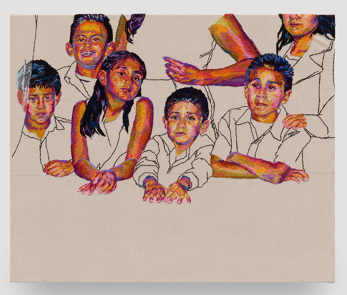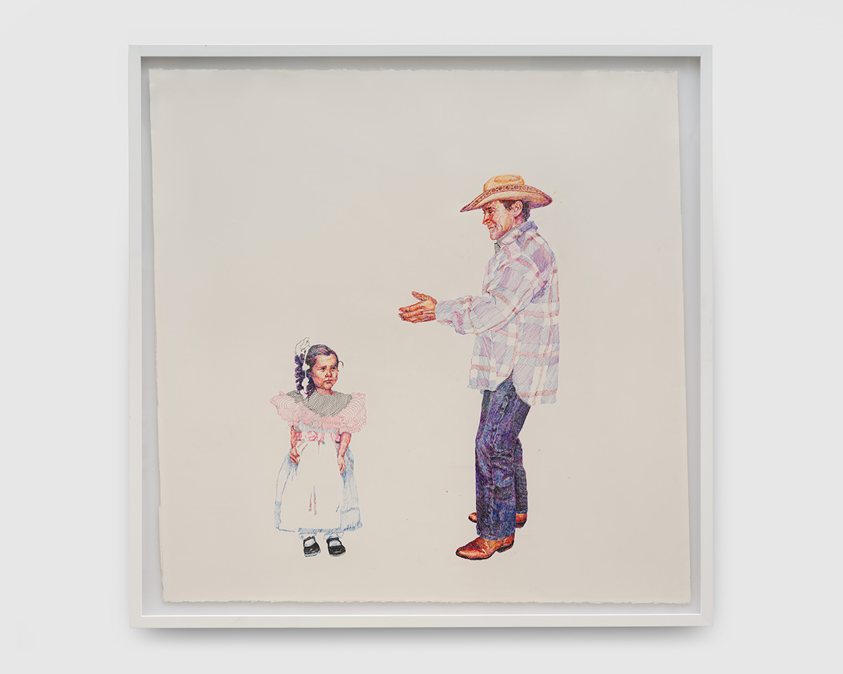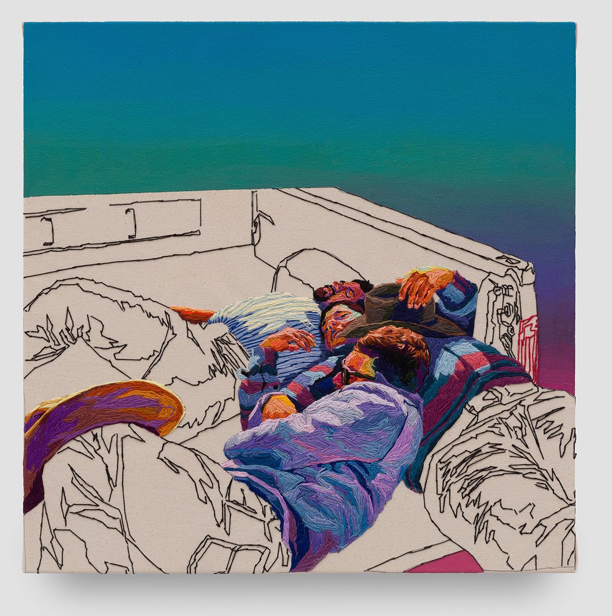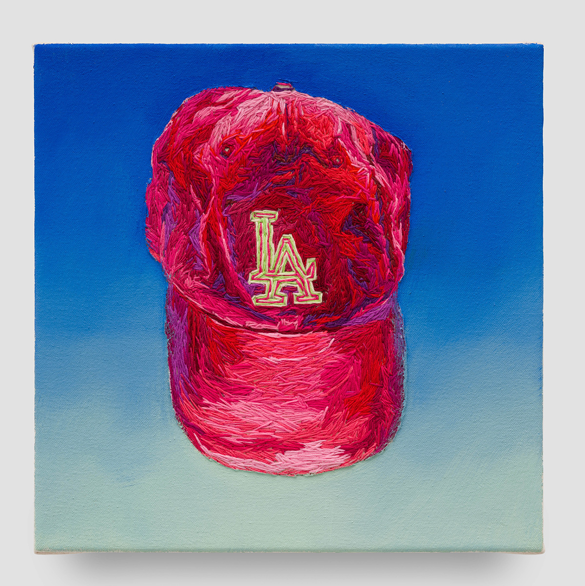 “Amanecer / Atardecer (Sunrise / Sunset)” marks García Hamilton’s first exhibition with Charlie James Gallery. Her works involve a combination of embroidery and oil painting. As a first-generation American, García Hamilton investigates legacies of tradition, the inevitability of assimilation, and the ways in which family histories replay themselves over time. She draws from an archive of family photos and stories, threading family members together across generations and borders. Many of the works in the exhibition feature García Hamilton’s late grandfather and her young nephew, his great-grandson who he never got a chance to meet. Her use of embroidery is similarly a reflection of her family history as it is something she took up after the passing of her grandfather. Both of García Hamilton’s grandparents worked in textiles and her grandfather was also the storyteller of the family.