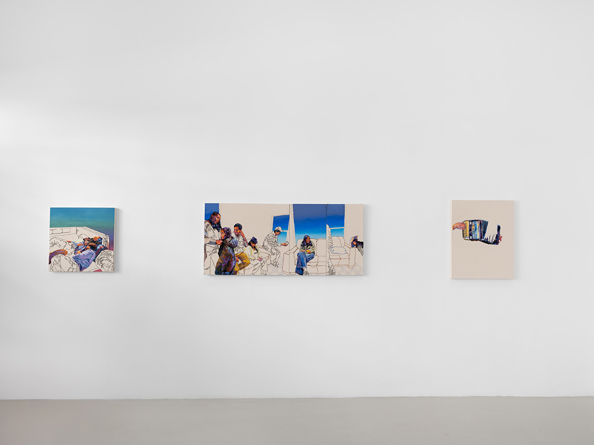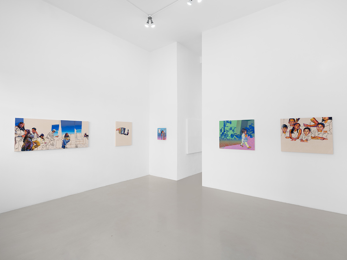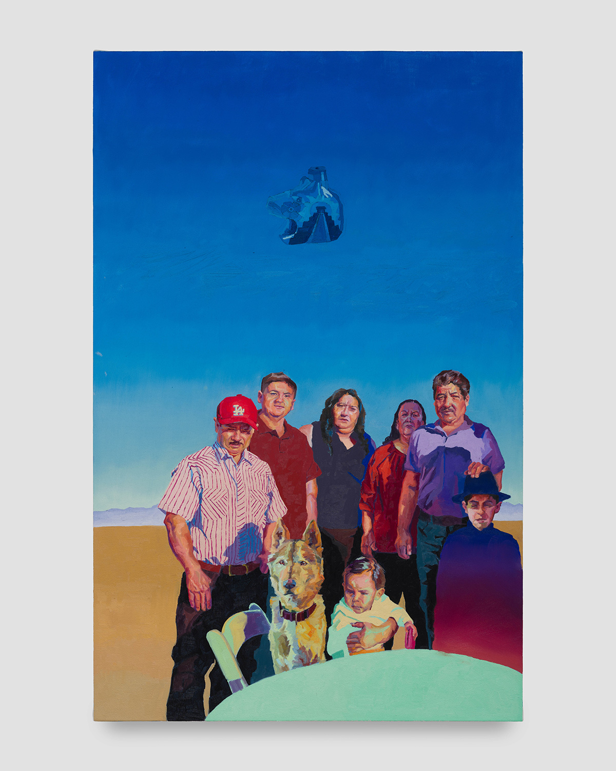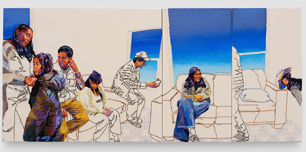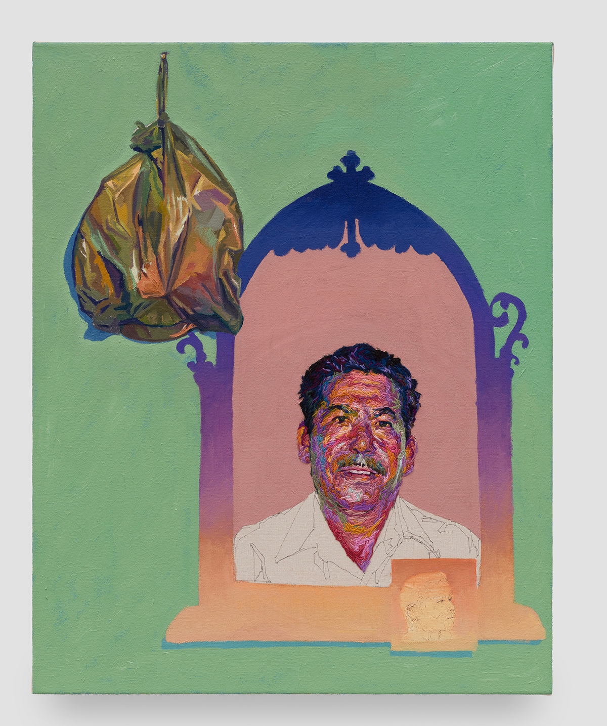 A series of hybrid canvases by Mexican-American artist Daniela García Hamilton. García Hamilton received her Bachelors of Fine Arts in Drawing and Painting from California State University Long Beach. Her work explores the rituals and traditions she experienced as a child of immigrant parents. Integrating colour and pattern throughout, García Hamilton explores the vibrancy of her traditions through portraits of her family members and settings that are fabricated to draw attention to social-political commentary on past and current immigrant experiences.
